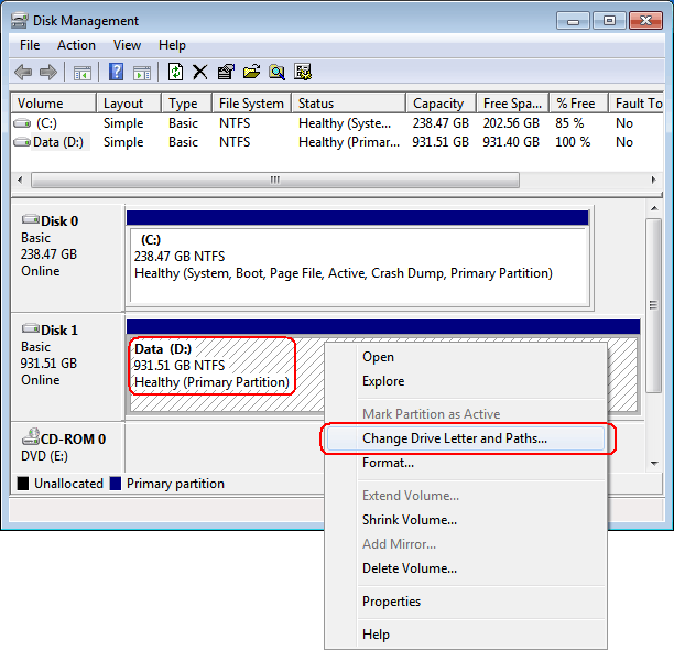 2. Select second drive (D:), right click and select the menu item Change
